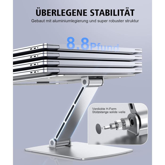 - [Langlebiges und Einzigartiges Design] Dieser Laptopständer ist einzigartig und verfügt über eine verbreiterte z-förmige einzelstangenstruktur, die ihn von anderen laptopständern auf dem markt unterscheidet. Im gegensatz zu herkömmlichen doppelstangen-designs bietet das minimalistische design platzersparnis und sorgt für stabilität. Die spindel hat eine lebenserwartung von über 3.000 zyklen, was Langlebigkeit und soliden halt gewährleistet.
