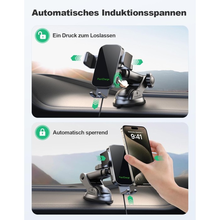- 【Automatisierter Komfort genießen】 Kabelloses Laden ohne manuelle Einstellungen! Unser wireless charger auto klemmt automatisch und öffnet sich auf Knopfdruck. Einfach das Telefon hineinlegen, der 3-Achsen-Klemmarm sichert es automatisch. Und was noch toller ist: Der eingebaute 40-mAh-Akku (wird nur für die Klemmarme verwendet) ermöglicht das Öffnen und Klemmen zum einfachen Herausnehmen des Telefons, selbst nachdem das Auto ausgeschaltet wurde.