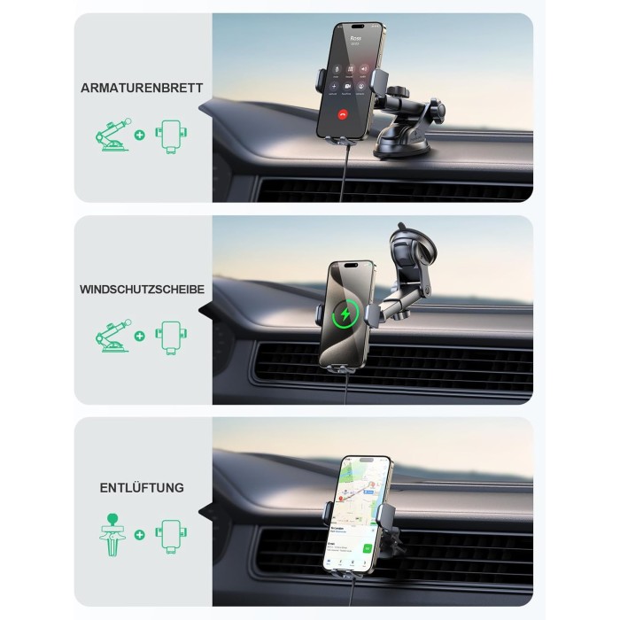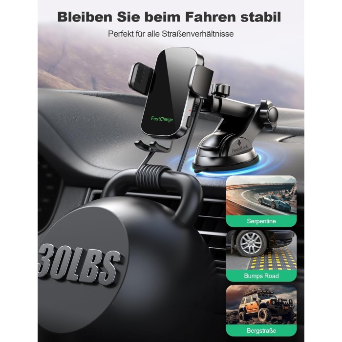 - 【Sicherer Halt für Ihr Telefon】 Unser kfz handyhalterung mit ladefunktion verwendet einen leistungsstarken Vakuumsaugnapf, der Ihr Telefon bei extremem Wetter, Vibrationen oder unebenem Gelände sicher befestigt. Hinweis: Der Saugnapf ist nicht für Ledermaterialien geeignet. Wenn das Armaturenbrett aus Leder ist oder die Saugnäpfe nicht ausreichend haften, verwenden Sie bitte stattdessen den Lüftungshalter (Saugnapf wiederverwendbar nach Reinigung und Trocknung.)