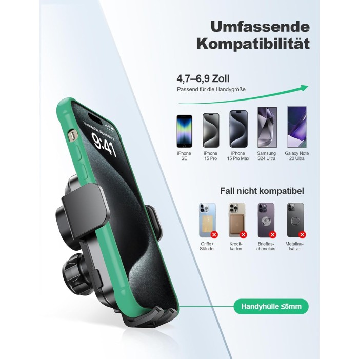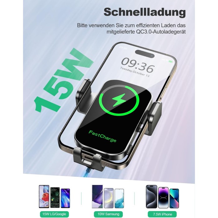 - 【Blitzschnelle Ladegeschwindigkeit】 Das handyhalterung auto induktives laden ist mit einem QC 3.0 Autoladegerät ausgestattet, das mit einer maximalen Leistung von 15 W sogar durch eine bis zu 5mm dicke Handyhülle schnell aufladen kann. Es bietet breite Kompatibilität mit einer Vielzahl von Handys Marken und Modelle, kompatibel mit iPhone-Serie (4,7 bis 6,9 Zoll), Galaxy-Serie (eignet sich für die Galaxy Z FOLD-Serie (Z FOLD 1/2/3/4/5/6), aber nicht für alle Modelle der Galaxy Z FLIP-Serie).