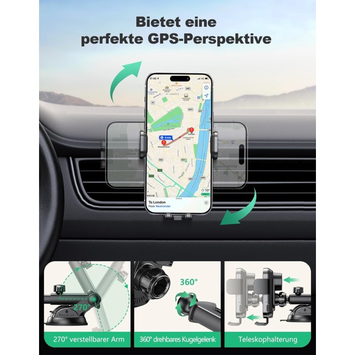 - 【Flexible Anpassungsmöglichkeiten】 Unsere wireless car charger bietet Ihnen eine Vielzahl an einstellbaren Winkeln, um Ihren individuellen Bedürfnissen gerecht zu werden! Mit dem 360° drehbaren Kugelgelenk und dem drehbaren Saugnapfdesign können Sie den perfekten Betrachtungswinkel leicht einstellen. Der Arm ist zudem um 270°verstellbar (von 3,54 bis 4,92 Zoll ausgezogen), sodass Sie den idealen Blickwinkel für GPS-Navigation oder freihändige Telefonate erreichen können.
