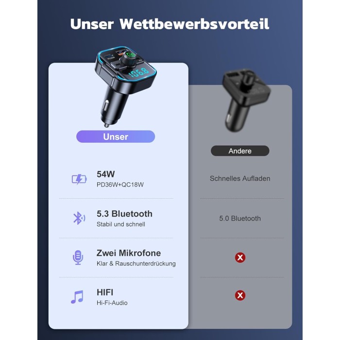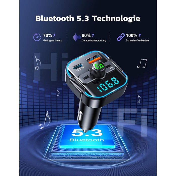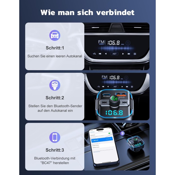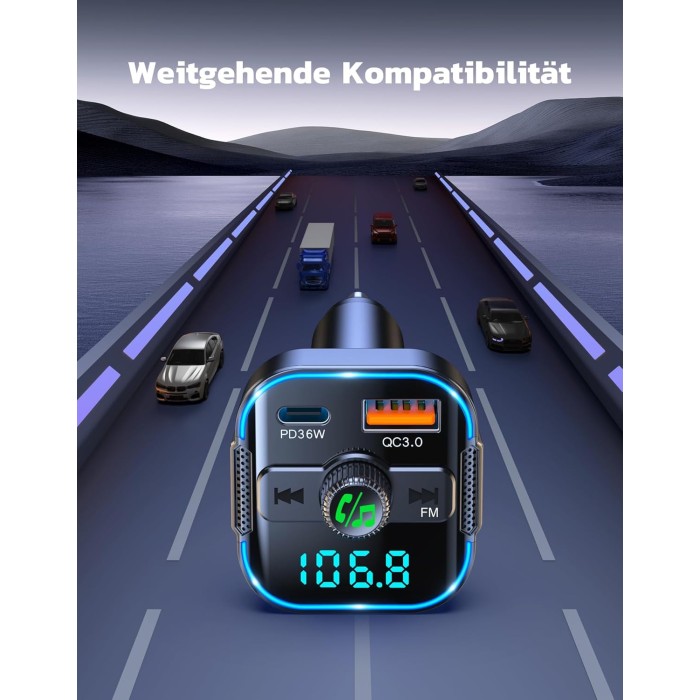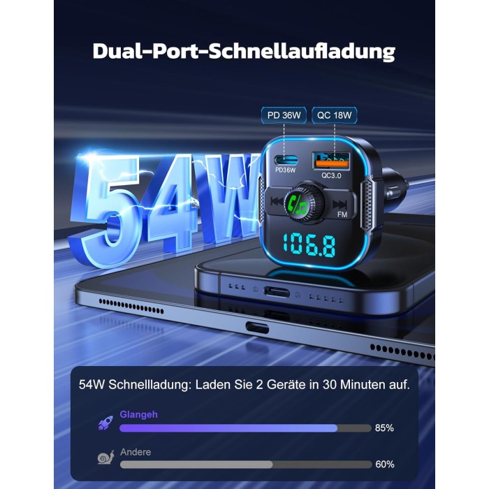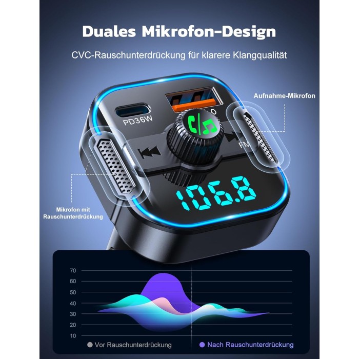 - Schnelles und sicheres Laden mit bis zu 54W: Der Glangeh transmitter für auto Bluetooth verfügt über zwei USB-Typ-C-Anschlüsse (PD 36 W und QC 18 W), die gleichzeitiges schnelles Laden ermöglichen – fünfmal schneller als Standardladegeräte. Dank intelligenter Sicherheitsfunktionen können Sie sicher und effizient laden, ohne sich um Überladung, Überlastung, Überhitzung oder Kurzschlüsse sorgen zu müssen.