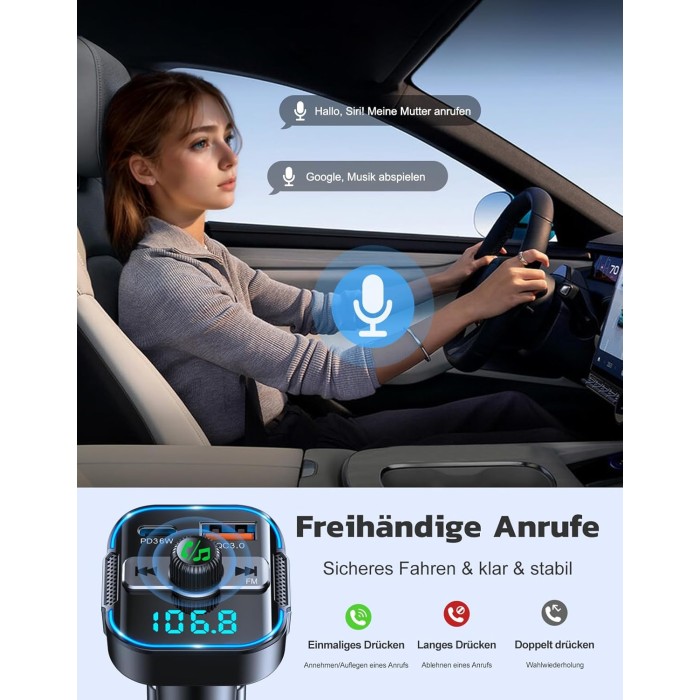 Glangeh 2-in-1 Bluetooth Adapter Auto & Schnelles Autoladegerät (PD 36W & QC3.0 18W) - Neuester FM Transmitter Zigarettenanzünder mit Dual Mikrofon, unterstützt Siri-Assistent & Freisprecheinrichtung
