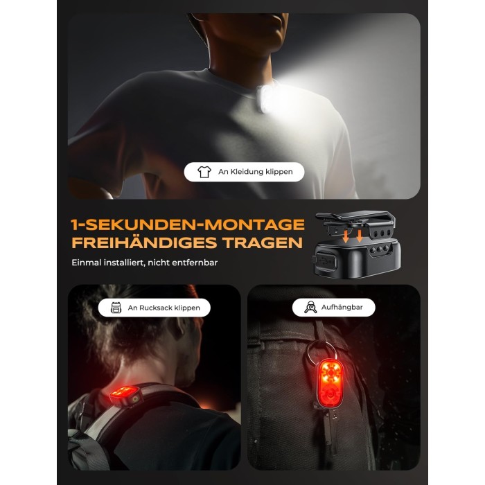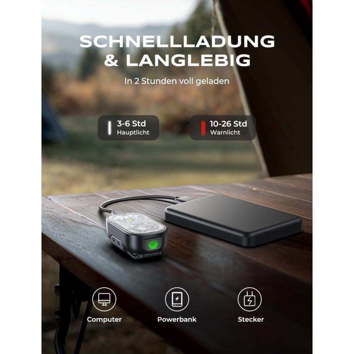 - Schnellladung für langanhaltende Beleuchtung: Laden Sie diese lauflicht joggen in nur 2 Stunden für durchgehende Helligkeit auf. Genießen Sie 3 Stunden im Fernlicht, 6 Stunden im Abblendlicht und zuverlässige 26 Stunden im 'SOS'-Modus. Ein grüner Indikator warnt bei unter 20% Akku.