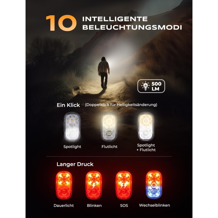 - 500LM Strahlfokussierung bis Flächenlicht: Genießen Sie die Brillanz unserer 500LM Clip led taschenlampe für intensive, langanhaltende Helligkeit. Wechseln Sie mühelos zwischen Punkt- und Flutlichtmodus – vom fokussierten Fernlicht für Trail-Erkundung bis zum breiten Nahlicht für großflächige Ausleuchtung beim Klettern oder Laufen.