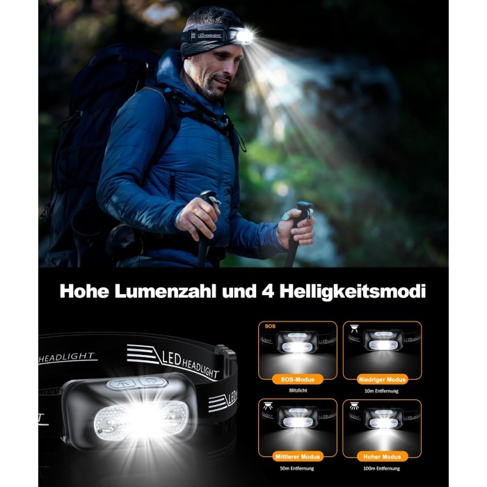 - 【Handfreie Bewegungssensor-Steuerung】Verfügt über einen Infrarot-Bewegungssensor mit einem Erfassungsbereich von 4 Zoll/10cm. Bewegen Sie einfach Ihre Hand vor dem Angelbeleuchtung stirnlampe LED, um ihn ein- oder auszuschalten, wenn Ihre Hände mit anderen Tätigkeiten beschäftigt sind.