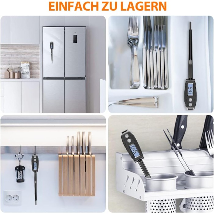 - 【Einfaches Ablesen】 Das bratenthermometer digital verfügt über eine hellblaue hintergrundbeleuchtung, die bei bedarf aktiviert werden kann und ein einfaches ablesen der temperatur bei schlechten lichtverhältnissen oder in kochumgebungen ermöglicht. Darüber hinaus speichert die sonde des thermometers den aktuellen temperaturmesswert auch dann, wenn es von der speise entfernt wird, wodurch es einfach ist, die temperatur.der speise zu überwachen.