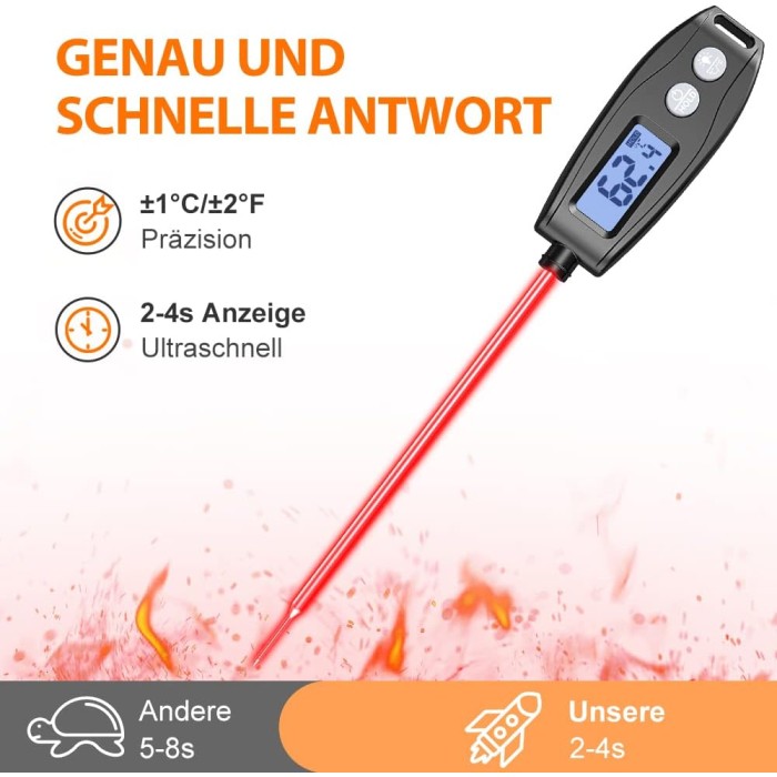 - 【Sofortige und Genaue Messwerte】 Das bratenthermometer liefert sofortige und präzise messwerte der innentemperatur von lebensmitteln innerhalb von 2-4 sekunden. Es verfügt über zwei anzeigemodi für celsius und fahrenheit, sodass sie jedes mal mit perfektem timing kochen können. Die temperaturgenauigkeit beträgt ±1°c (±2°f) zwischen -20°c und 150 °c (-4°f bis 302°f).
