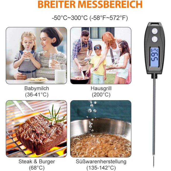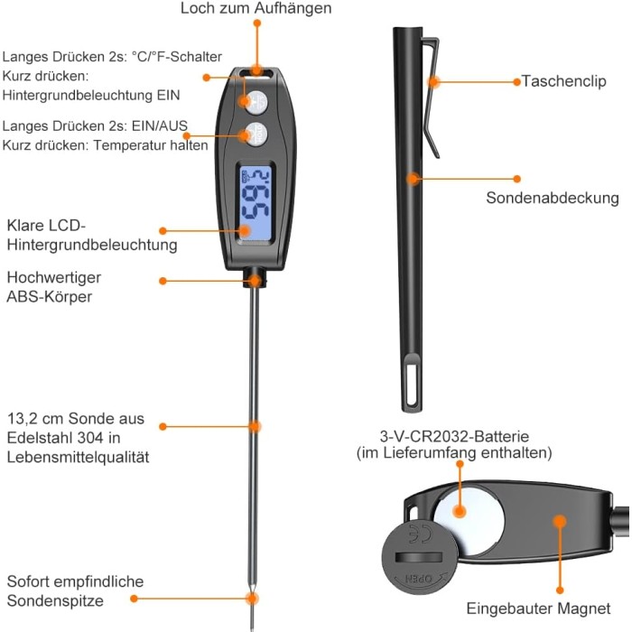 - 【Ultralange Sonde】 Dieses thermometer küche ist mit einer 5,2 zoll (13,21 cm) langen sonde aus hochwertigem 304-edelstahl in lebensmittelqualität ausgestattet. Dieses material gewährleistet nicht nur ihre sicherheit während des gebrauchs, sondern bietet auch eine höhere genauigkeit bei der erkennung der innentemperatur von lebensmitteln, was zu einem überlegenen kocherlebnis führt.