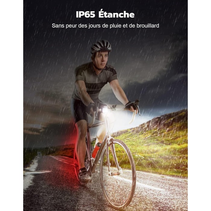 - [Modes d'Éclairage DIY Innovants] Ne vous inquiétez plus des obstacles pendant la nuit avec ce compagnon indispensable! Le feu avant velo dispose de 4 modes d'éclairage et le feu arriere velo propose 6 modes, y compris une fonction de mémoire. Avec une visibilité exceptionnelle, les cyclistes derrière vous vous repéreront facilement, et le mode flash respiratoire qui n'éblouit pas améliore la sécurité globale.
