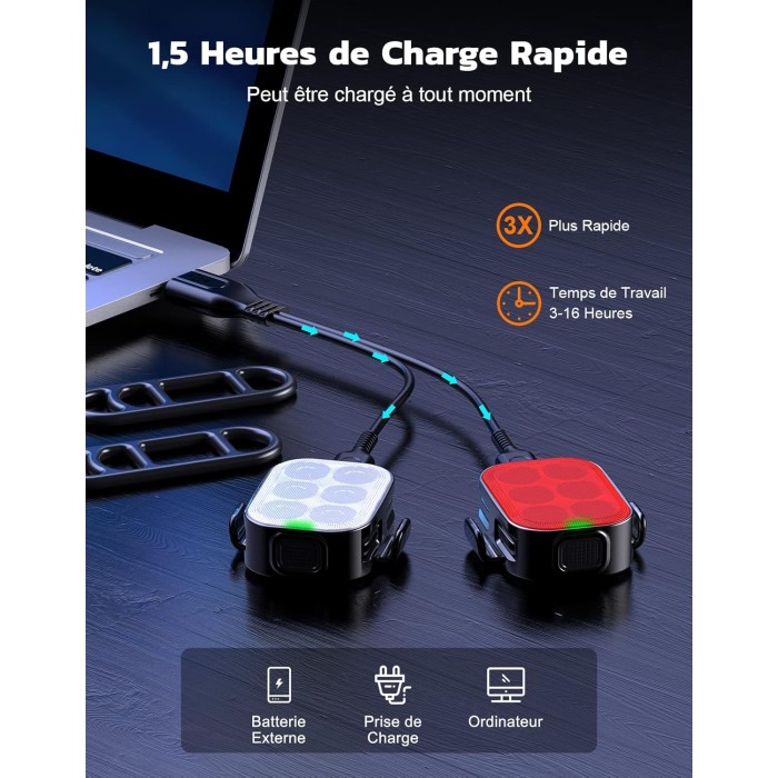 - [Modes d'Éclairage DIY Innovants] Ne vous inquiétez plus des obstacles pendant la nuit avec ce compagnon indispensable! Le feu avant velo dispose de 4 modes d'éclairage et le feu arriere velo propose 6 modes, y compris une fonction de mémoire. Avec une visibilité exceptionnelle, les cyclistes derrière vous vous repéreront facilement, et le mode flash respiratoire qui n'éblouit pas améliore la sécurité globale.